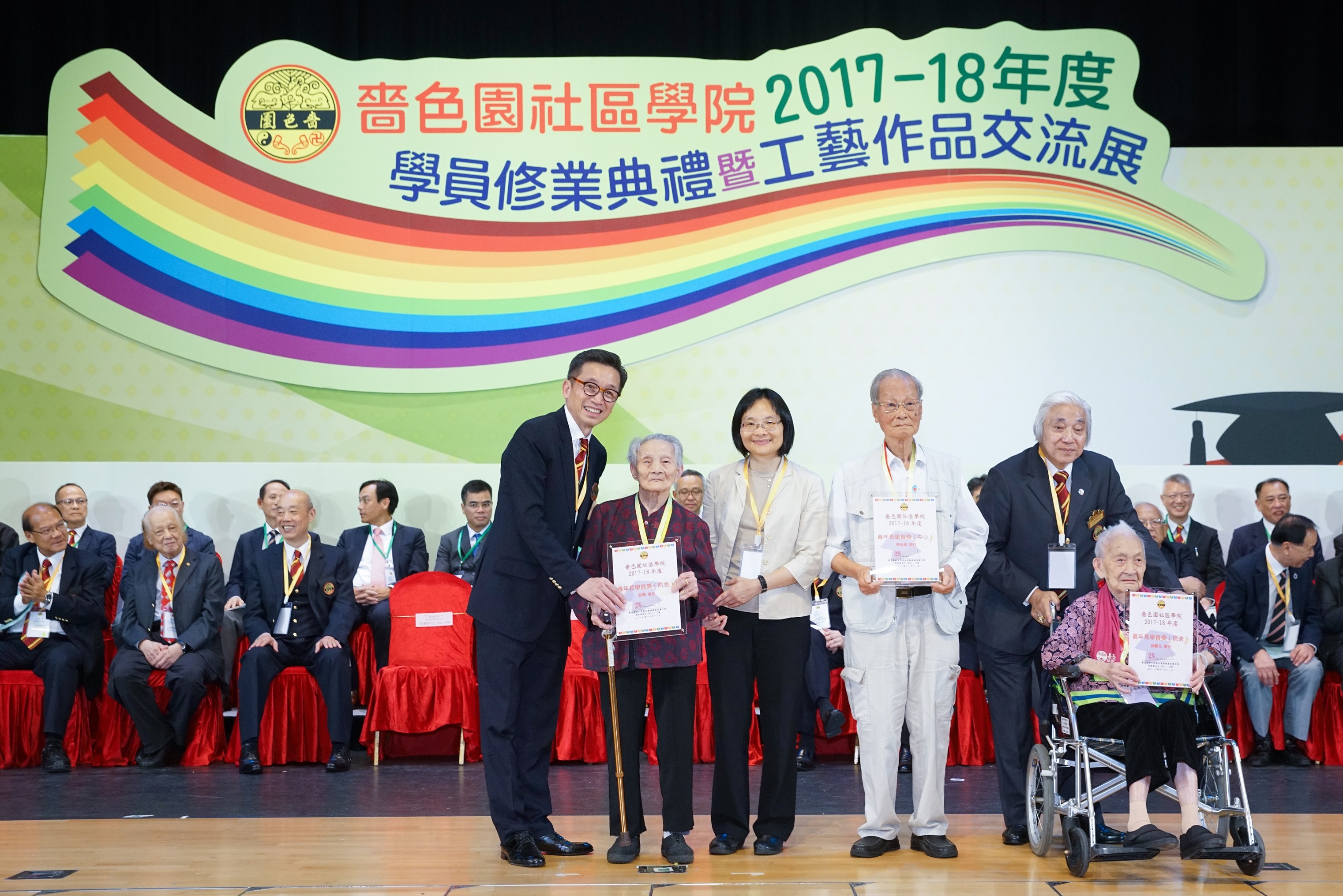 學習是成長與發展的基石,不同年齡人士的身、心、社、靈均需要不斷學習和成長,增進技能和知識以達至個人成長及回饋社區的目標。2017-2018年度「嗇色園社區學院學員修業典禮暨工藝作品交流」於2017年11月11日假座沙田鄉議局大樓大劇院舉行。  承蒙安老事務委員會主席林正財醫生、社會福利署黃大仙及西頁區福利專員呂少英女士蒞臨主禮,並致送紀念品予學院顧問、協作團體及義務導師;而嗇色園社區學院院長李耀輝監院、在嗇色園副主席兼社會服務委員會主席馬澤華先生陪同下,頒授證書及獎項予各修業學員。出席嘉賓亦參觀學員工藝作品交流展,對學員的才華大加讚賞。