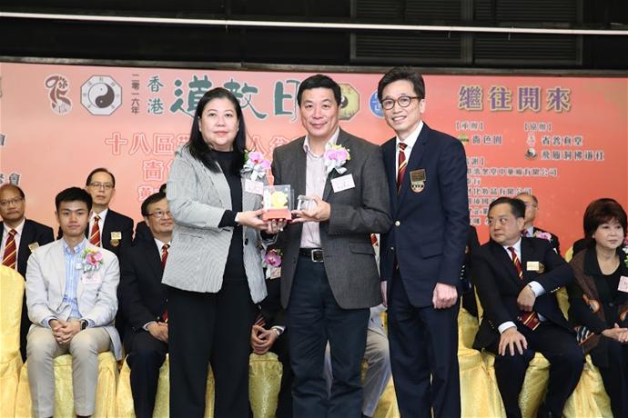 嗇色園馬澤華副主席(右一)及2016年道教日十八區敬老萬人盆菜宴統籌葉文均主席(左一)致送紀念品予黃大仙區議會主席李德康先生